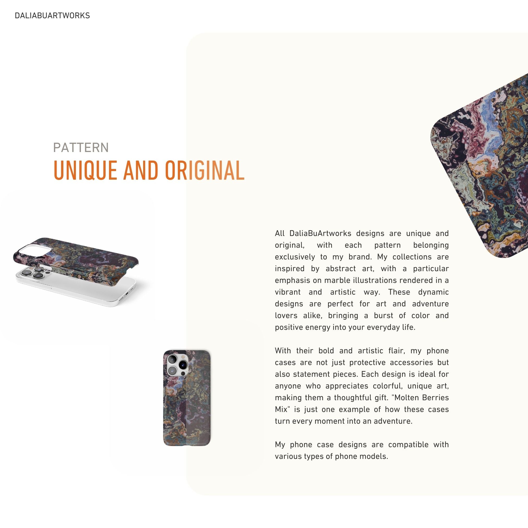 Original, abstract, logo-free designs by DaliaBuArtworks — printed on world-class materials with a premium glossy finish and non-fade prints. Each piece is crafted with timeless design, scratch resistance, and full protection, so your device stays safe in style for years to come.
